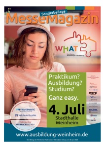 stieg und kann aus einer Vielzahl spannender Wege wählen. Der Weinheimer Ausbildungs- und Studientag ist die ideale Gelegenheit, direkt mit Betrieben, Hochschulen und Institutionen ins Gespräch zu kommen, Berufe praktisch zu erleben und wertvolle Kontakte zu knüpfen. Nutzen Sie diese Chance, um Ihre Fragen zu stellen und Ihren individuellen Weg zu entdecken. Unser Dank gilt allen Unternehmen, Bildungseinrichtungen und Unterstützern, die mit ihrem Engagement diese Messe möglich machen. Wir wünschen Ihnen viel Freude beim Lesen und einen erfolgreichen Tag voller Inspiration und neuer Perspektiven auf dem Weinheimer Ausbildungs- und Studientag 2025! Herzliche Grüße Mirjam Lohrer 2. Vorsitzende Weinheimer Bündnis Ausbildung e.V. wir freuen uns, Ihnen das Messemagazin zum Weinheimer Ausbildungs- und Studientag 2025 präsentieren zu dürfen. Auch in diesem Jahr haben wir für Sie ein informatives und praxisnahes Magazin zusammengestellt, das die vielfältigen Ausbildungs- und Studienmöglichkeiten in Weinheim und der Region aufzeigt. Gerade für Ausbildungssuchende und Studieninteressierte bieten sich aktuell so viele Chancen wie selten zuvor. Die Nachfrage nach motivierten Nachwuchskräften ist hoch und die Auswahl an Ausbildungsplätzen, dualen Studiengängen und Studienmöglichkeiten war selten so vielfältig. Unternehmen und Hochschulen sind offen für neue Talente, bieten attraktive Einstiegsmöglichkeiten und unterstützen junge Menschen aktiv beim Start ins Berufsleben. Wer sich jetzt informiert und engagiert, hat beste Aussichten auf einen erfolgreichen Einliebe LESERINNEN UND LESER, Vorwort vom Oberbürgermeister ���������������������������������������������5 WHAT 2025 – Das erwartet dich �����������������������������������������������6 Azubi oder Studi? ���������������������������������������������������������������������7 Echte Einblicke in die Berufswelt ���������������������������������������������8 Board zur Berufsorientierung �������������������������������������������������10 Der Hallenplan �����������������������������������������������������������������������12 Die Aussteller ���������������������������������������������������������������������������13 Bewerbungsfotos vom Profi ���������������������������������������������������17 Bafög ���������������������������������������������������������������������������������������18 Wohnort im Studium �������������������������������������������������������������19 Impressum �������������������������������������������������������������������������������16 Bild: Marco Schilling Entdecke die spannende Welt der Berufe und gestalte deine Zukunft aktiv mit. Auf der Seite ausbildung-weinheim.de findest du alles rund um Praktikum, Ausbildung und Studium, speziell zugeschnitten auf deine Interessen und Ziele. Lass dich inspirieren und finde den Weg, der zu dir passt! Der WHAT als Präsenzmesse findet am 4. Juli von 9 bis 16 Uhr in der Stadthalle in Weinheim statt.